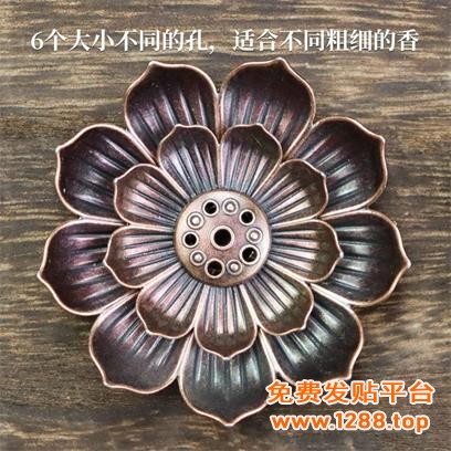 产品信息: 品名:莲花香插 品牌:民艾天下 材质:合金 直径:约为5.5cm 储存:保存妥当,长期使用 适用:卧室、书房、茶室等 购买方式: 拼多多搜索(艾天下企业店),进店购买。 莲花香插,孔洞分明,纹路清晰,6个大小不同的孔,适合不同粗细的香,搭配民艾天下的线香使用,早上熏檀香,工作时熏沉香,休息时熏鹅梨帐中香,驱蚊净化空气熏艾草香。